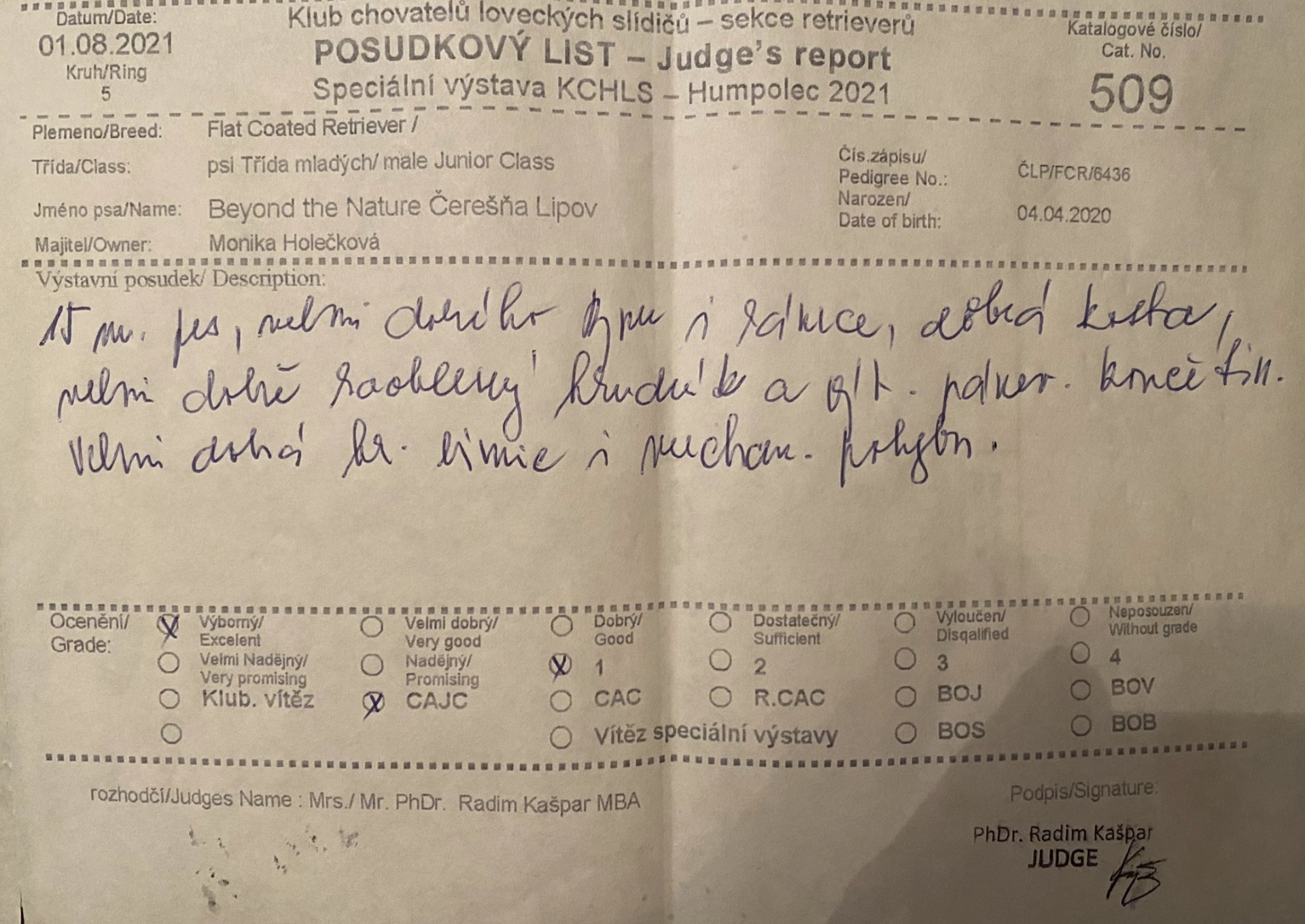 "Barney" Beyond the Nature (14 m.) - Exc. 1, CAJC fulfilled the conditions for the title of Czech junior champion